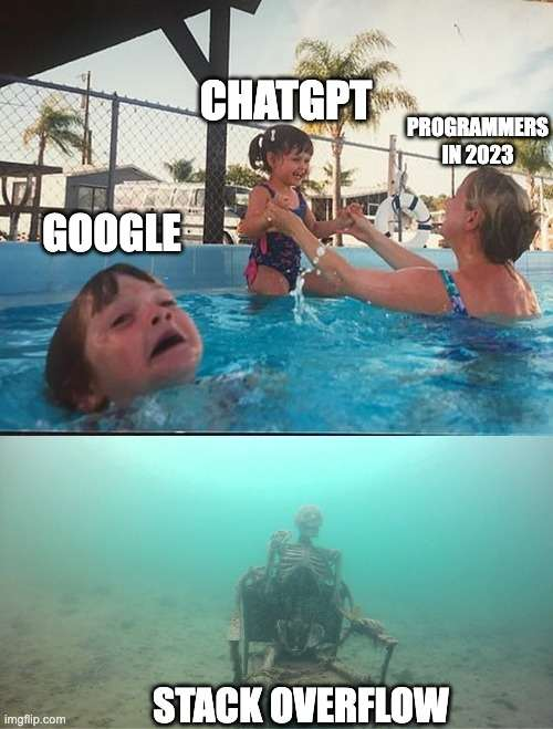 [이미지2: 풀장 밈 - ChatGPT 사용자(물놀이하는 아이들) vs Stack Overflow(해골)]