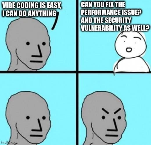 [이미지4: Wojak 현실 체크 밈 - 자신감 넘치는 vibe coder가 성능/보안 이슈를 발견하는 모습]