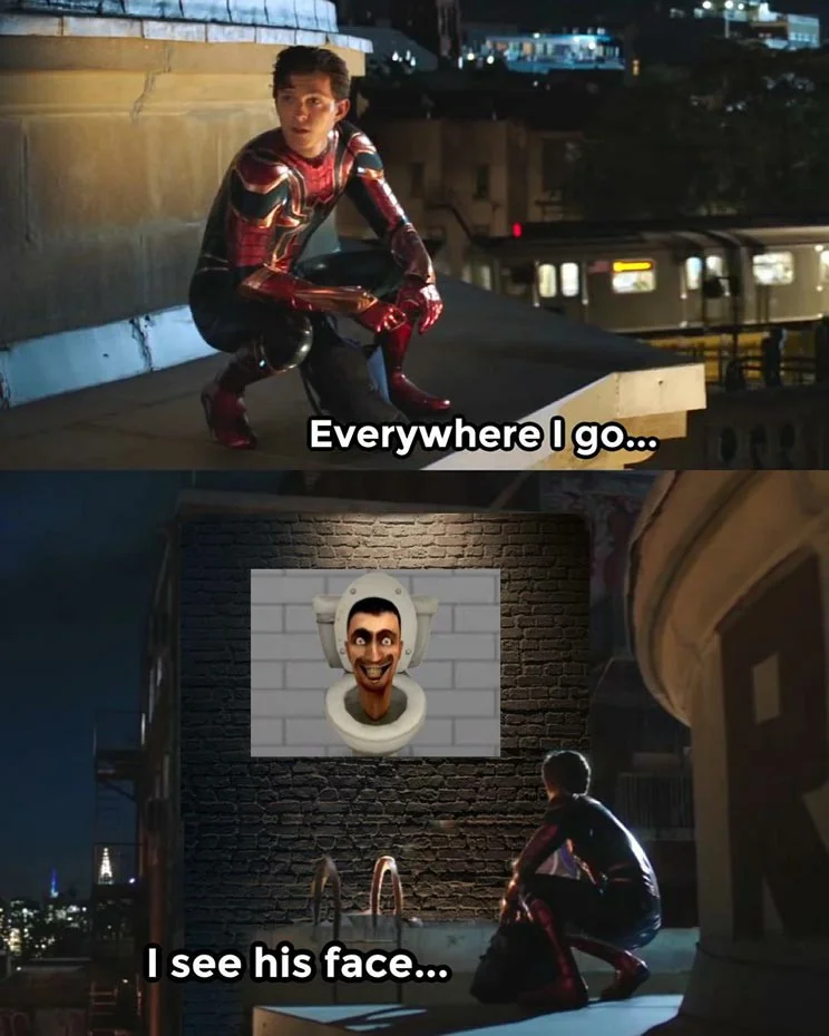 - AI로 실사화한 사람이 변기통에서 머리만 내미는 **Skibidi Toilet(스키비디 토일렛)**을 하고 있습니다. (의미? 없습니다. 그냥 기괴함.)